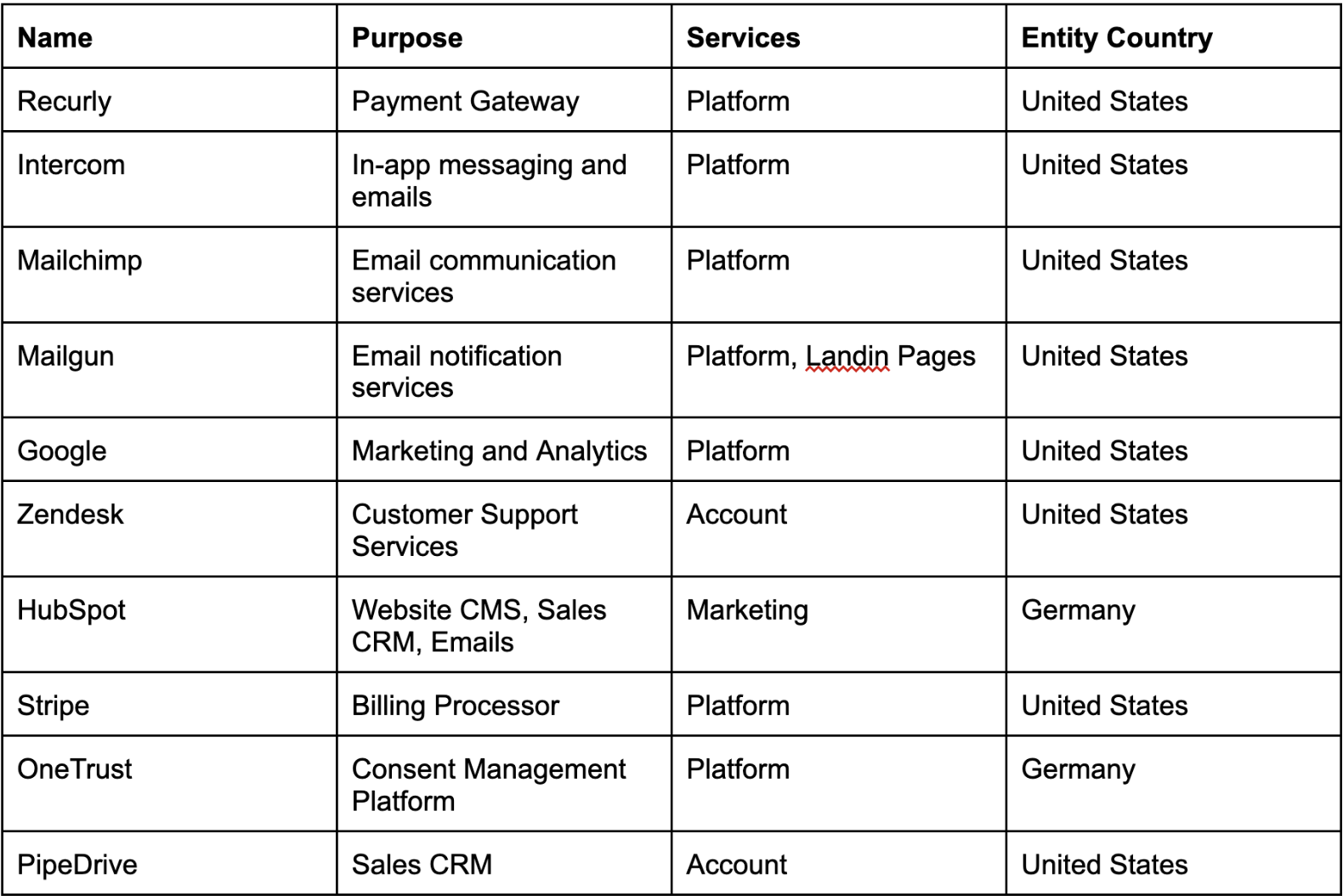 | Mailchimp | Email communication services | Platform | United States |