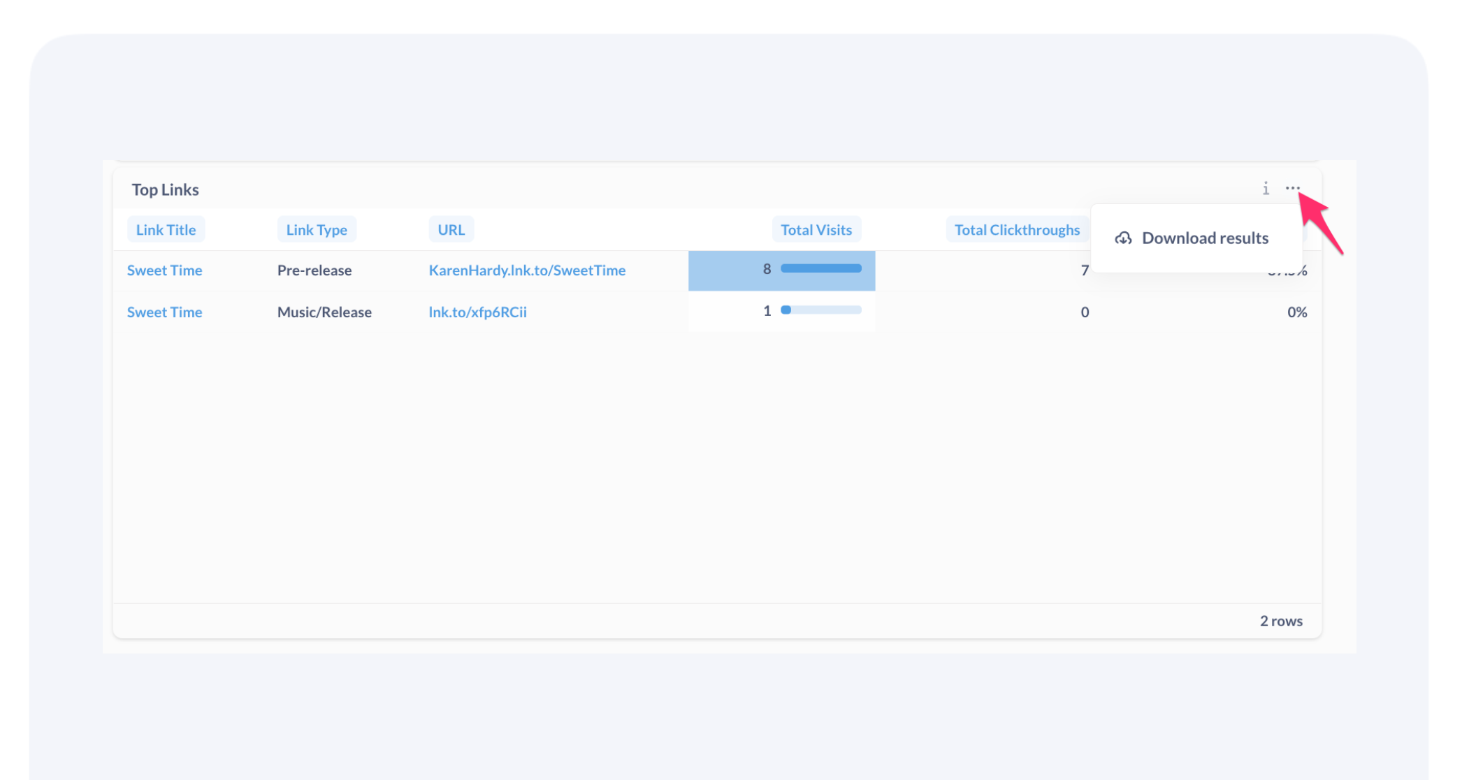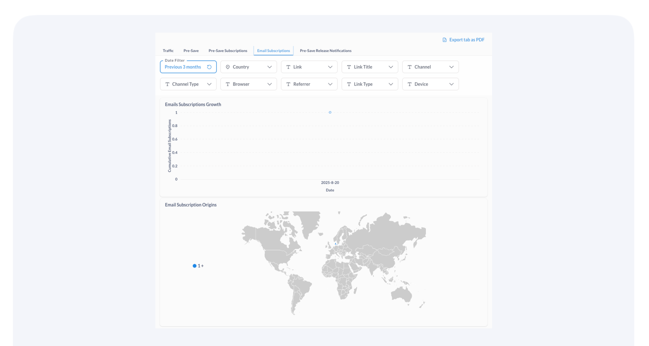 - Pre-Save Subscriptions Dashboard: Subscriptions, Conversion Rate, Top Links driving sign-ups