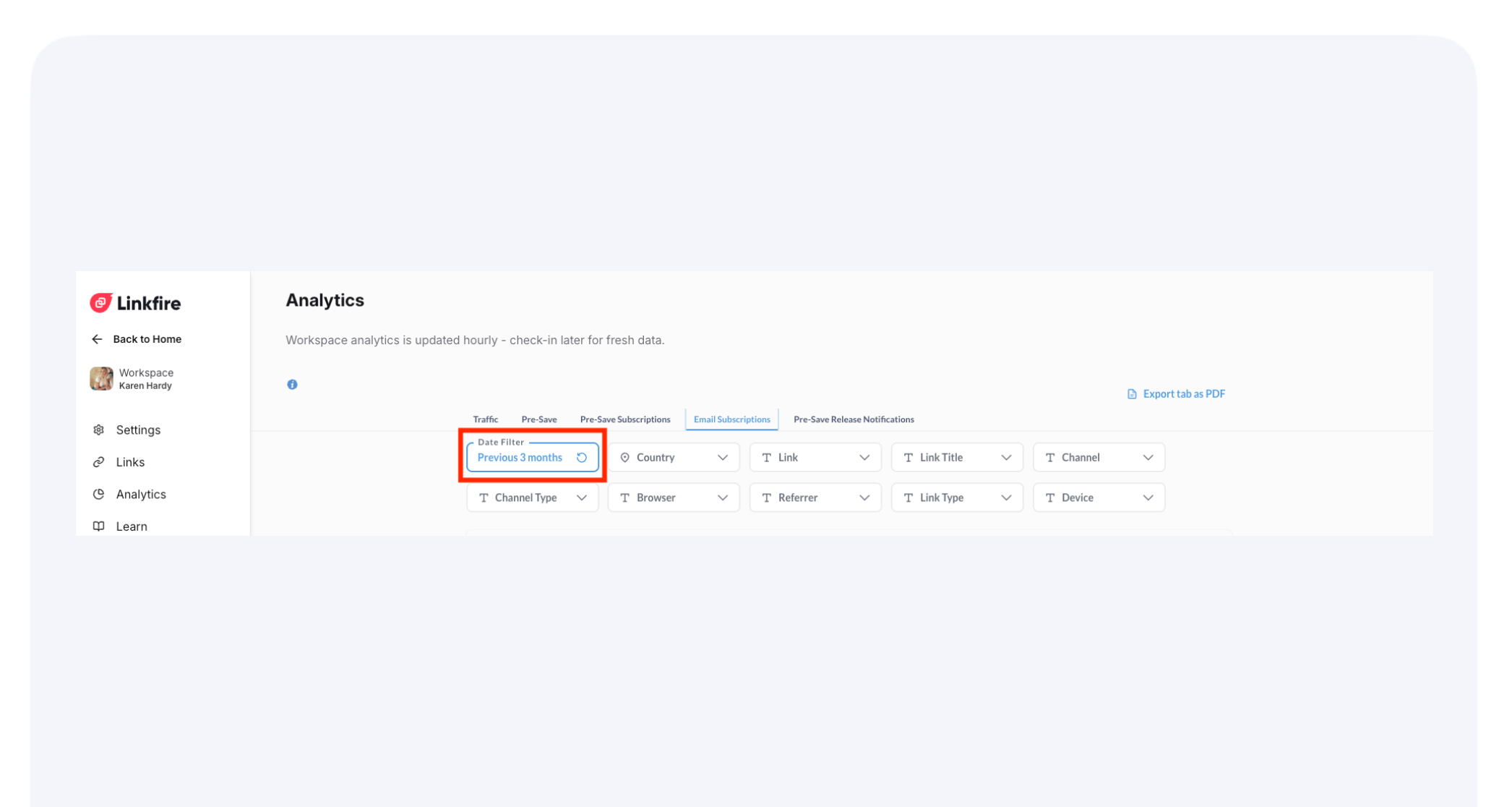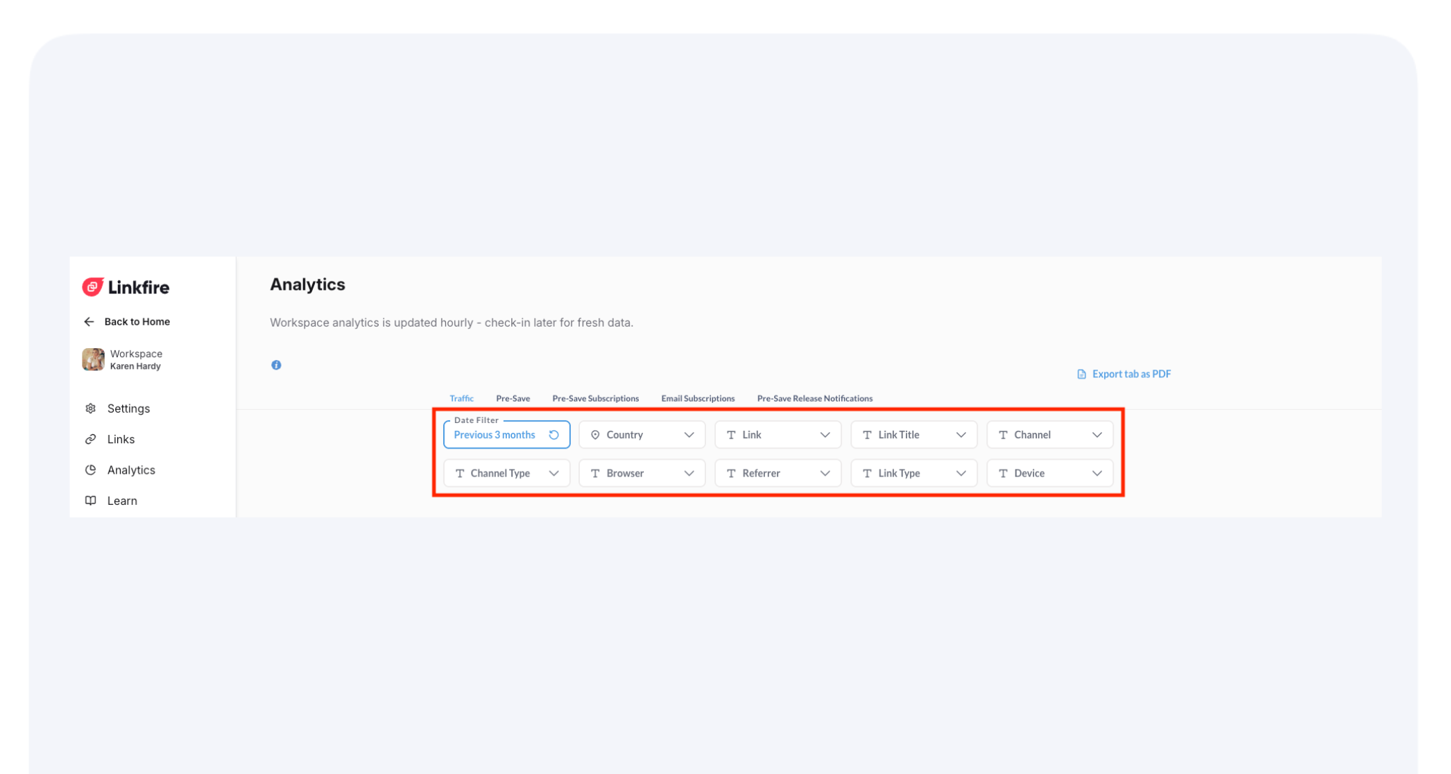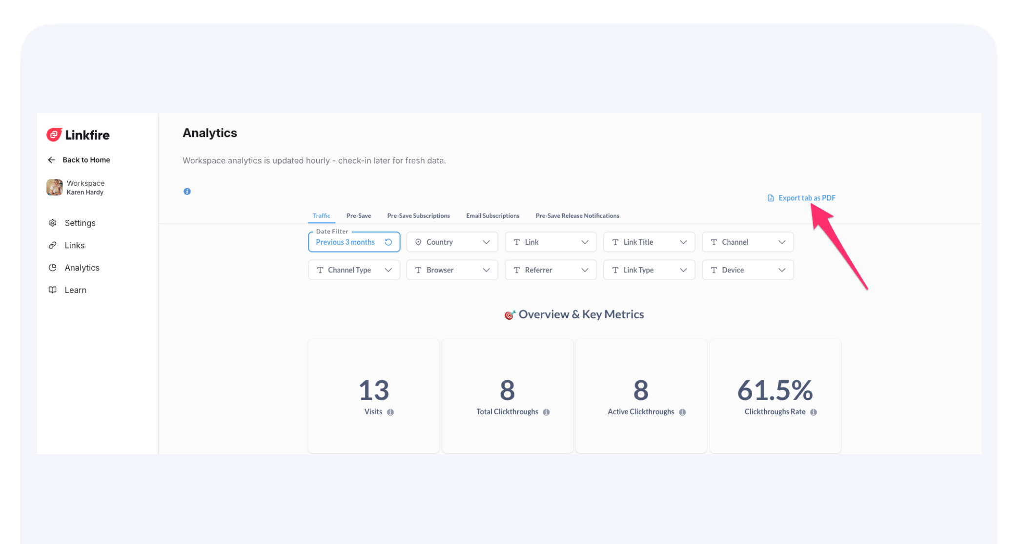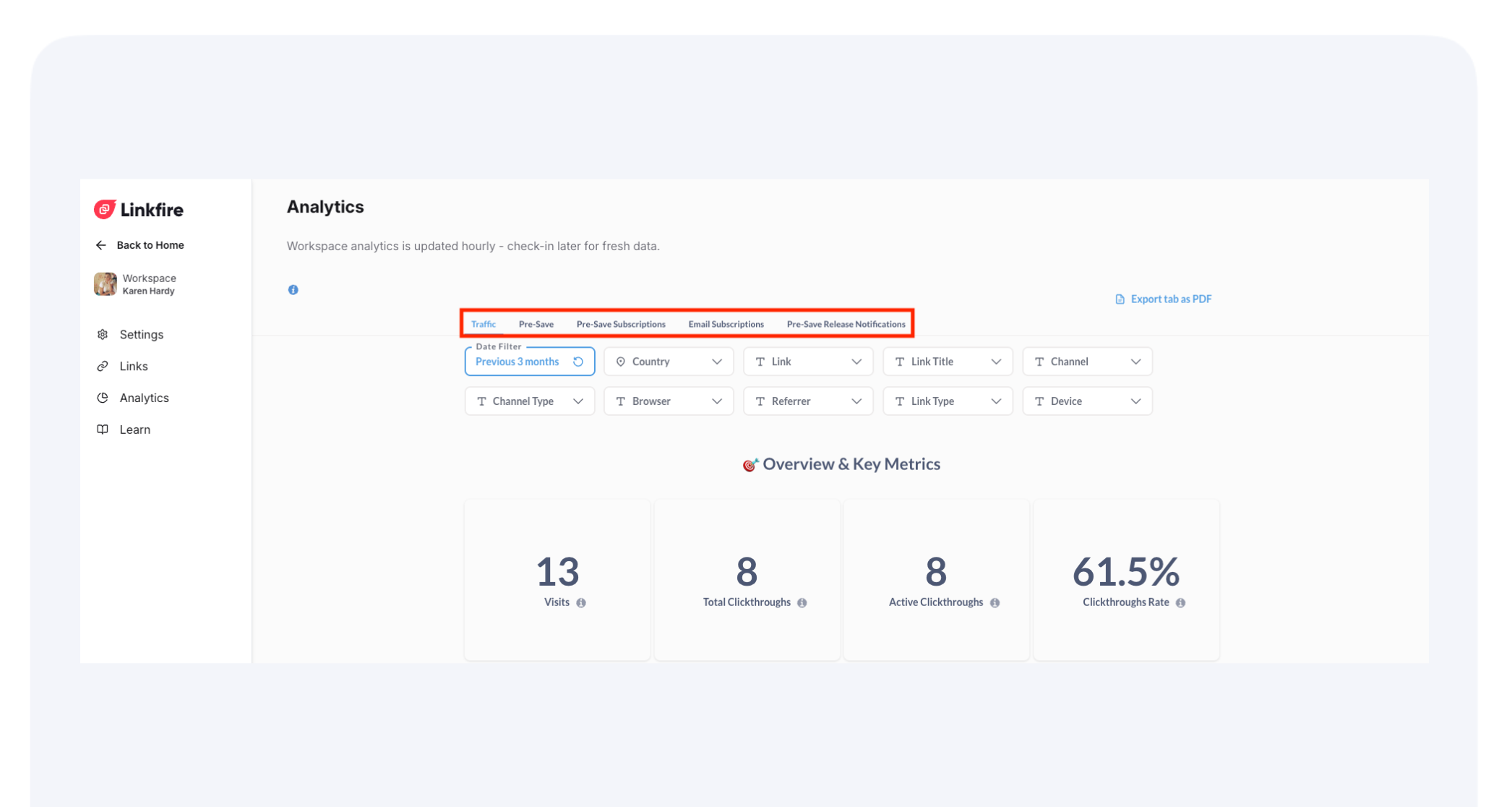 Workspace Analytics gives you flexible, exportable insights into your fans and traffic. With sticky filters, hourly data updates, PDF exports for quick reporting, and CSV downloads for detailed analysis, you can easily track and share performance across your team.